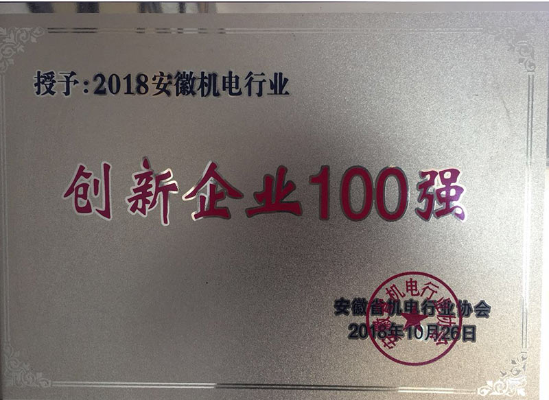 安徽機(jī)電行業(yè)創(chuàng)新企業(yè)100強(qiáng)證書